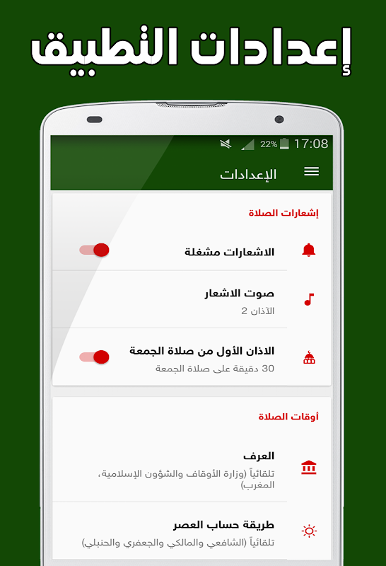 - تذكير قبل موعد الأذان، مع إمكانية اختيار موعد التذكير لكل صلاة على حدة