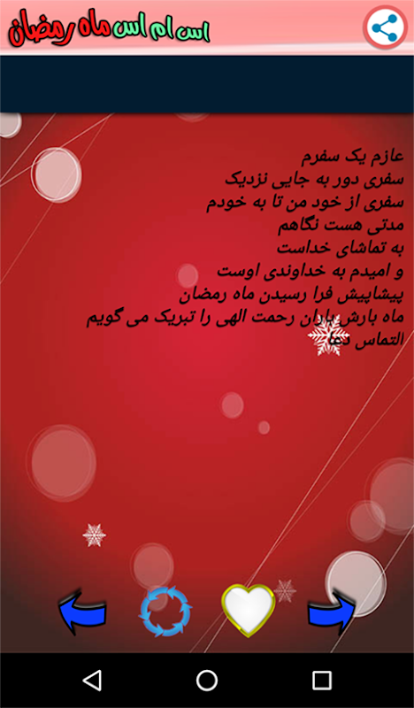 اس ام اس ماه رمضان فارسی نرم افزار آندروید به زبان فارسی است ، که در آن یک گروه از اس ام اس, مانند اس رمضان، تبریک رمضان، ماه رمضان مبارک , دعای ماه رمضان, پیامک ماه رمضان ,اس ام اس ماه رمضان, اس ام اس سرکاری ماه رمضان, اس ام اس خنده دار ماه رمضان عكس زيبا