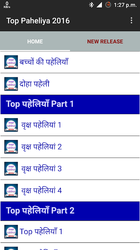 This app contains collection of Paheli with clean and clear interface in Hindi text with correct answers to each Paheli.