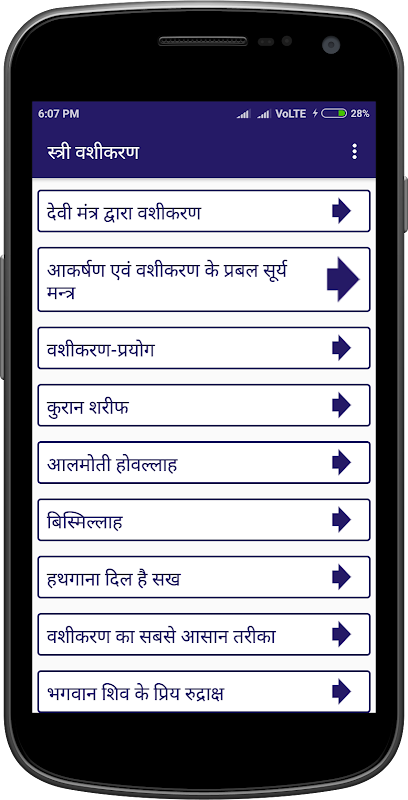 Stri Vashikaran mantra is derived from the great vedic and astrological ancient indianhistory. vashikaran mantra is stronglerelated to attraction to control others feeling to some extent. daily life too much problems make people upset and disturbed then after people wantsmart solution from their expert Pandit or Guru. In the vashikaran process there is involvement of vashikaran totke. this app contins one of the more totke of vashikaran to impress or attract some one.