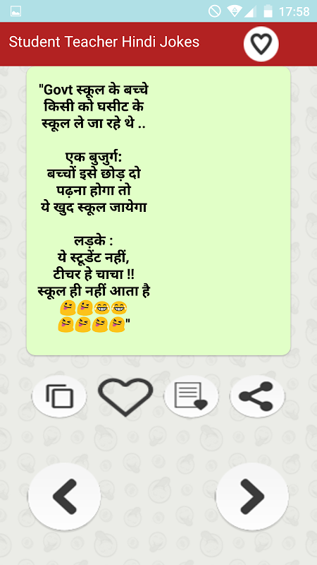 Facebook Twitter whatsappなどのソーシャルネットワーキングサイトを介して友達や家族と共有することを楽しむことができる、最も面白くてエンターテインメントの高いヒンディー語ジョークのコレクション。 Facebook Instagram twitter Linkedin Googleなど、およびWhatsApp Snapchat Hikeなどのチャットメッセンジャー。ジョークをテキストとして、またはJPGまたはPNG形式の画像として、携帯電話の内部ストレージメモリまたは携帯電話のSDカードに保存することもできます。後で写真として共有します。
