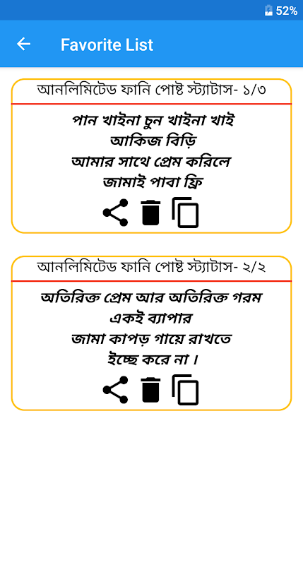 আরআমাদেরএইঅ্যাপটিথেকেপ্রত্যেকটিপোষ্টওস্ট্যাটাসসকলেরকাছেশেয়ারওকপিকরারসুবিধারয়েছে。 এবংথিমপরিবর্তনকরারঅপশনওরয়েছে。 unnyকরিআপনাদেরকাছেআমাদেরএই-আনলিমিটেডএফবিফানিপোষ্টওস্ট্যাটাস-面白いステータスএইঅ্যাপটিখুবইভালোলাগবে。