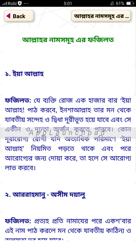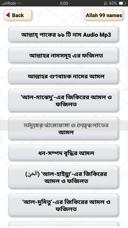 আসসালামু আলাইকুম।সবাইকে অসংখ্য ধন্যবাদ জ্ঞাপন করছি আমার এই অ্যাপটি তে যার মূল বিষয়বস্তু হচ্ছে আল্লাহ পাকের ৯৯টি নাম ও ফজিলত ।অডিও সহ এই অ্যাপ টিতে পাচ্ছেন আল্লাহ্র ৯৯ টি নাম ও অর্থ অডিও সহকারে। মহান আল্লাহ্ রাব্বুল আলামিন আমাদের সৃষ্টি কর্তা যার গুনের কোনও শেষ নাই। আসমান ও যমীনে এ যা কিছু বিদ্যমান সবই আল্লাহ্ এর দান। তাই আসমাউল হুসনা কি ও আল্লাহ এর গুনবাচক নাম এর তালিকা সহ শিখতে চাইলে অ্যাপ টির সাথে থাকুন।