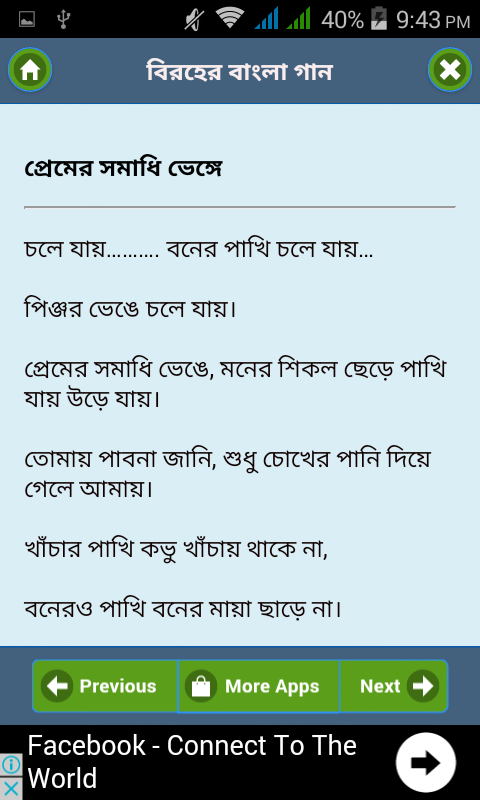 গানের সাথে বাংলাদেশের মানুষের সম্পর্ক সেই আদিম কাল থেকে। এ দেশের মানুষ তাঁদের মনের সুখ, দুঃখ, আনন্দ, বেদনা সবকিছুই প্রকাশ করে গানের মাধ্যমে। গানই একমাত্র উপায় যার মাধ্যমে মানুষ তাঁর মনের ভিতরে লুকিয়ে থাকা চাপা কষ্ট সঠিকভাবে প্রকাশ করতে পারে। এই অ্যাপ এ আমরা কষ্টের বাংলা গান এবং বেদনার বাংলা গান দিয়েছি যেই গান মানুষের মনের কথা বলে মনের কষ্টের কথা বলে। আমাদের এই বেদনা ভরা গানগুলো বাংলাদেশের সকল সময়ের সর্বকালের সবচেয়ে কষ্টের এবং জনপ্রিয় বাংলা গান যা আপনার ছখে পানি এনে দিবে। আমাদের মধ্যে অনেকেই ভালোবাসার মানুষকে হারিয়ে পথে পথে ঘুরছেন কিন্তু কিছুতেই মনের ভিতরে লুকিয়ে থাকা চাপা কষ্ট কিছুতেই প্রকাশ করতে পারছেন না এই বেদনার গানগুলো আপনি মুখুস্থ করে নিজে একা একা গাইতে পারেন তা আপনার মনের জ্বালা কিছুটা হলেও কমাবে। কষ্টের বাংলা গানের লিরিক্স আপনি সহজেই মুখুস্ত করতে পারবেন।