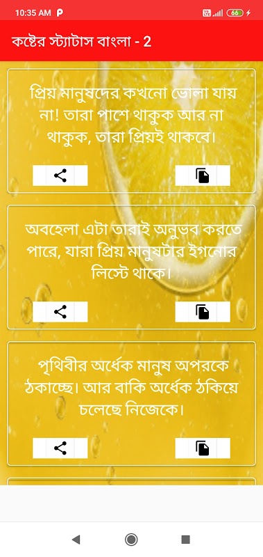 বাংলা কষ্টের স্ট্যাটাস App-টিতে রয়েছে বেশ কিছু বাস্তব জীবনের কষ্টের স্ট্যাটাস ও এসএমএস, আশাকরি আপনাদের মনের মতো স্ট্যাটাস এখানে পাবেন। বাংলা কষ্টের স্ট্যাটাস বা Sad Status Bangla App থেকে যে কাউকে খুব সহজেই স্ট্যাটাস পাঠাতে পারবেন।