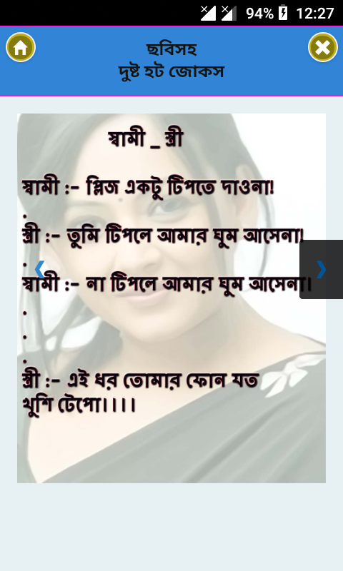 জোকস পড়তে এবং জোকস পড়ে হাসতে সকলেই ভালোবাসে আর সেই জোকস যদি হয় ছবিসহ তাহলেতো হাসির কোন শেষই থাকে না। ছবিতে হাসির হট জোকস অ্যাপ এ আমরা সেরা সকল হাসির জোকস ইমেজ একসাথে করে এই অ্যাপ এ দিয়েছি। এখানকার সকল হট জোকস ইমেজ দেখে যেমনি আপনি অনেক মজা পাবেন তেমনি অনেক হাসিও পাবেন। এই অ্যাপ এর সকল দুষ্ট হট জোকস আপনাদের সকল মানুষের এবং সকল বয়সি মানুষের জন্য তৈরি করেছি যেটি আশাকরি আপনাদের কাছে ভাললাগবে। আপনি হয়তো অনেক ছবিতে ধাঁধা এবং ছবিতে হট জোকস দেখেছেন আমরা আশাকরি যেকোনো জোকসের চেয়ে আমাদের এই বাংলা হট জোকস ইমেজ আপনাদের কাছে বেশী ভালো লাগবে।