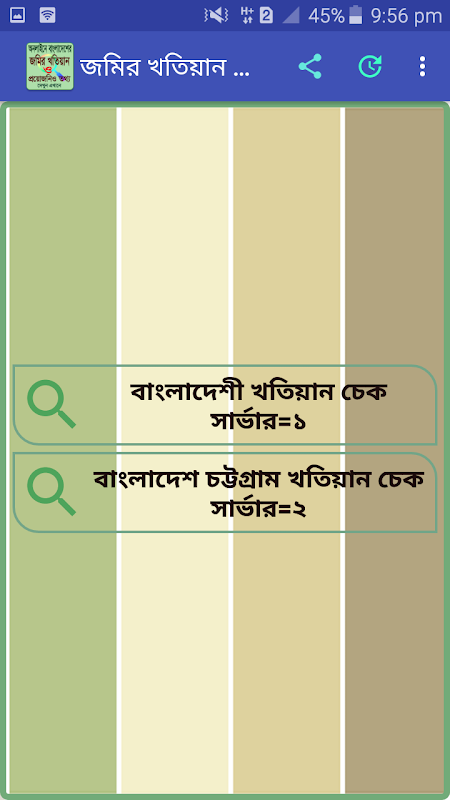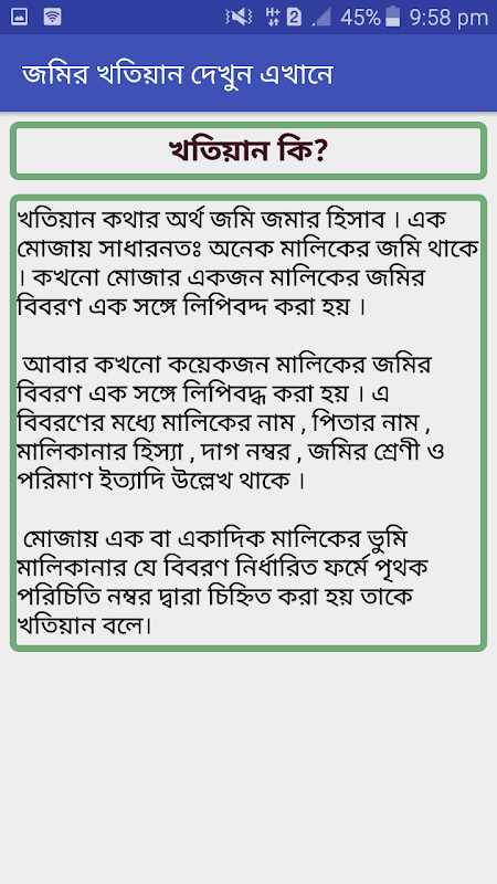 জমির খতিয়ান দেখুন এখানে,আপনি শুধু আপনার খতিয়ানের নাম্বার অথবা সংশিষ্ট মৌজার দাগ নাম্বার দিবেন, বিস্তারিত খতিয়ান চলে আসবঘরে বসে আপনার ভূমির খতিয়ানের সকল তথ্য পেতে এই এপটি ব্যবহার করুন, একই সাথে এই এপে পাবেন নামজারী বা নাম খারিজ, নামজারির অপশন।