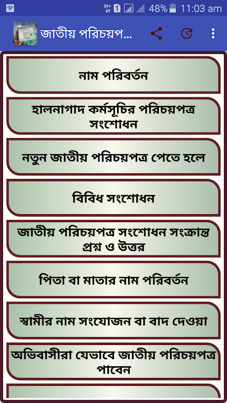 Bangladesh is digitized and improving so quickly. We are improving their economic and technology condition. Every country use a ID card for their Identification. Bangladesh has started to make a Smart ID Card for the people.In 2 October 2016,smart card delivery has started already. Their are some other issue which is how to find my lost national id card, how can i get my new national id card. How to change incorrect name of id card. All above matters are discussed in this app National Identity Card. This is very useful app which can help you a lot and you will find out the solutions regarding Voter ID.