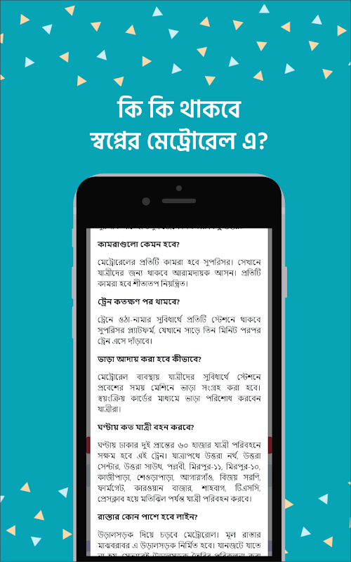 বাংলাদেশের মানচিএ উজ্জল করে আসছে মেট্রোরেল। এই মেট্রো ট্রেন এর গতি হবে ঘন্টায় শত কিলোমিটার যা ঢাকা ম্যাপ অতিক্রম করবে চোখের নিমিষে। বাংলা সংবাদপত্র যারা পড়েন ও বাংলাদেশ tv যারা দেখেন তারা বাংলাদেশ বিষয়াবলী ও বাংলাদেশ মানচিত্র সম্পর্কে জানেন। গত কিছুদিন যা বাংলাদেশ পত্রিকা দখল করে আছে তা হল ট্রেন কোথায় আছে? কত দূর অগ্রগতি হল, ট্রেন টিকিট কোথায় পাওয়া যাবে, ট্রেনের সময় বা ট্রেন time কেমন হবে ইত্যাদি। তাই যারা অলরেডি ঢাকা বাস রুট অ্যাপ ব্যবহার করছেন, আর বাস টিকিট, বাস সার্ভিস, বাস ভাড়া ইত্যাদি জানতে পারছেন তাদের জন্য সুখবর। মেট্রোরেল অ্যাপ নিয়ে আসছে ঢাকার মেট্রোরেল এর সব তথ্য।