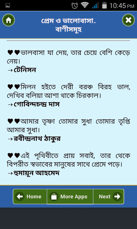 প্রেম ও ভালোবাসার উক্তি গুলো পড়ে আমরা যে শুধুমাত্র বাণীকারকদের সম্বন্ধে ধারণা পাব, এমনটি নয়। বরং এখান থেকে তাদের ভাষ্য অনুযায়ী জ্ঞান অর্জনের অভাবনীয় সুযোগও রয়েছে। আশা রাখি এই এ্যাপসটি আমাদের মধ্যে সর্বোচ্চ অনুপ্রেরণার একটি পাথেয় হবে। এখানে যাদের প্রেম ও ভালোবাসার বাণীগুলোকে একত্রিত করার চেষ্টা হয়েছে তাদের মধ্যে রয়েছে: কাজী নজরুল ইসলাম, রবীন্দ্রনাথ ঠাকুর, হুমায়ুন আহমেদ, হুমায়ুন আজাদ, হেলাল হাফিজ, শরৎচন্দ্র চট্টোপাধ্যায়, জীবনানন্দ দাশ, রুদ্র মোঃ শহীদুল্লাহ প্রমুখ। তাছাড়া, বিশ্বসেরা ব্যক্তিদের উক্তি তো আছেই।