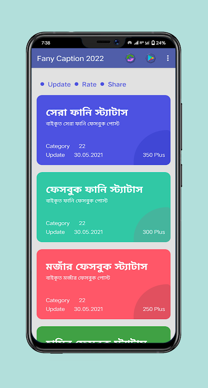 এই অ্যাপসটিতে যে সব মজার পোষ্ট আর ক্যাপশন আছে তা আপনি বন্দুদের সাথে ১ কিল্কে কপি এবং শেয়ার ক রতে পারবেন । প্রতিটি পোস্ট আর ক্যাপশন বাছাইকৃত ভাবে নেওয় া । আশা করি অ্যাপসটি আপনাদের অনেক ভালো লাগবে।