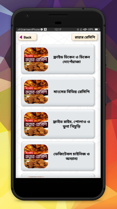 ベンガル料理のリストによると、アプリは、ベンガル料理のレシピに従ってさまざまなレシピを調理できるように配置されています。