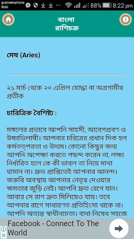 রাশিচক্র সম্পর্কে প্রায় সবারই জানার আগ্রহ বরাবরই বেশি।রাশিচক্রের মাধ্যমে সকলে তার জীবন যাএায় ভবিষ্যৎে কি ঘটতে চলেছে সেটা জানার চেস্টা করেন,অনেক কৌতুহল নিয়ে অনেকে হাত দেখান,কার কোন রাশি সেটা জানার চেস্টা করেন, আজকের দিনটি কেমন যাবে এরকম হাজারও প্রশ্ন মনে উদয় হয়।আর এসব সমস্যার সমাধান কল্পে আমরা আমাদের এই বাংলা রাশিচক্র এপসটি তৈরী করেছি,যার মাধ্যমে আপনারা নিজে নিজের রাশিচক্র সম্মন্ধে জানতে পারবেন।