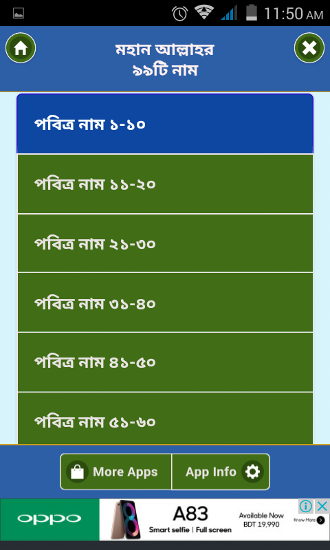 পবিত্র আল-কোরআনের বর্ণনা অনুযায়ী মহান আল্লাহ পাকের যে ৯৯টি নাম রয়েছে তা খুব সুন্দরভাবে উপস্থাপন করা হয়েছে এই এ্যাপসে। আশা করি, আপনাদের কাছে অনেক ভালো লাগবে।