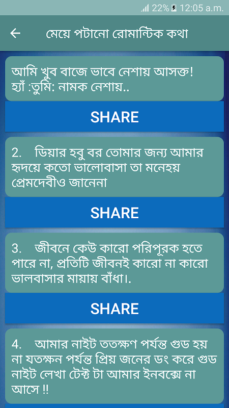 এমনই লাজুক ও নার্ভাস ধরণের ছেলেদের জন্য প্রেম করার কার্যকরী টিপস আমাদের এপ্সে।তাছাড়াবর্তমানে প্রায় সকল মানুষের ফেসবুক আইডি আছেফেসবুক এখন আমাদের কাছে বিনোদনের অনেক বড় একটা জায়গা হয়ে উঠেছে। অনেকেই এখন দিনের অনেকটা সময় ফেসবুক এ ব্যয় করে থাকে। আবার অনেকেই হয়তো ফেসবুকে স্ট্যাটাস দিতেও পছন্দ করেন। কিন্তু ঠিক ভাবে গুছিয়ে লিখতে না পারায় অনেকেই হয়তো status দিতে পারে না বা বিলম্ব বোধ করে । ফেসবুকে মানুষ তার মনের বিভিন্ন দুঃখ বেদনা কষ্টের কথা সেয়ার করে। প্রেমের ছন্দ,ভালোবাসার কথা, মেয়ে পটানোর উপায়, love sms,love massage,ভালোবাসার মেসেজ,প্রেমের উক্তি,ভালোবাসার উক্তি, বাংলা মেসেজ, প্রমের চিঠি,প্রেমের কবিতা, । নিজে কোনো দিন স্ট্যাটাস দেন না।বা কি লিখবেন তা খুজে পান না।তাদের জন্য আমার এ এ্যাপ্স।