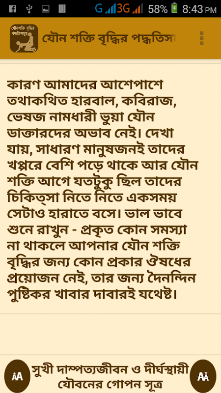 অথচ একটু জানা-শুনা থাকলেই আর sex power বাড়ানোর কিছু কৌশল শিখে নিলে ঘরে বসেই আর বিনা চিকিৎসাতেই আপনিও বাড়াতে পারেন আপনা যৌনশক্তি। মিলনে দীর্ঘস্থায়ী হওয়া, বীর্য ঘন করা, উত্তেজনা বৃদ্ধি আর মিলনে সফলকাম হওয়ার নিয়মাবলী নিয়ে সাজিয়েছি আমাদের এই অ্যাপলিকেশনটি। আশা করি সকলেরই কাজে লাগবে।