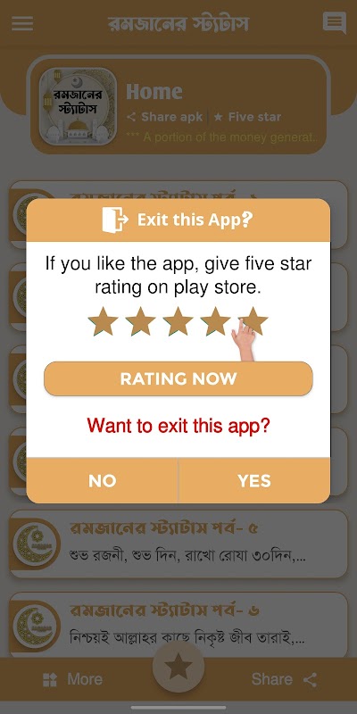 মাহে রমজান উপলক্ষে অনেকেই রমজানের এস এম এস ও ইস লামিক স্ট্যাটাস খুঁজেন বন্ধুদের সাথে শেয়ার ক রার জন্য! তাদের জন্য আমাদের এই অ্যাপ । যা আপনি নিজে পড়ুন এবং অন্য সবার সাথে শেয়ার কর ুন।ラマダンの SMS とステータス連絡先 連絡先 連絡先 連絡先 連絡先 連絡先ে শেয়ার করতে পারবেন অথবা ফেসবুক স্ট্যাটাস এ পো স্ট করতে পারবেন। এইসব ইসলামিক বানী বা বিখ্যাত উক্তি গুলোকে আপনを参照してください。 পারবেন ।