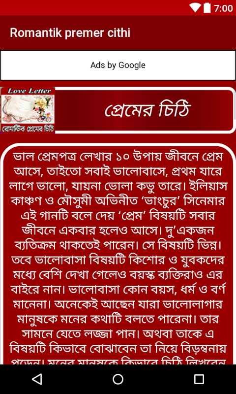 ভালোবাসার চিঠি সমূহঃ প্রেম করেছেন কিন্তু প্রেমিকাকে চিঠি লেখেননি? মিস করেছেন, আর তাই চট করে পড়ে নিন অন্যের মিষ্টি প্রেমের দুষ্ট চিঠি। আইডিয়া নিয়ে প্রিয়জনকে চমকে দেওয়ার মত একটা চিঠি লিখে ফেলুন!তাই আপনাদের জন্য এই এপ্লিকেশনে অসংখ্য প্রেমের চিঠির অর্ন্তভূক্ত করা হয়েছে।