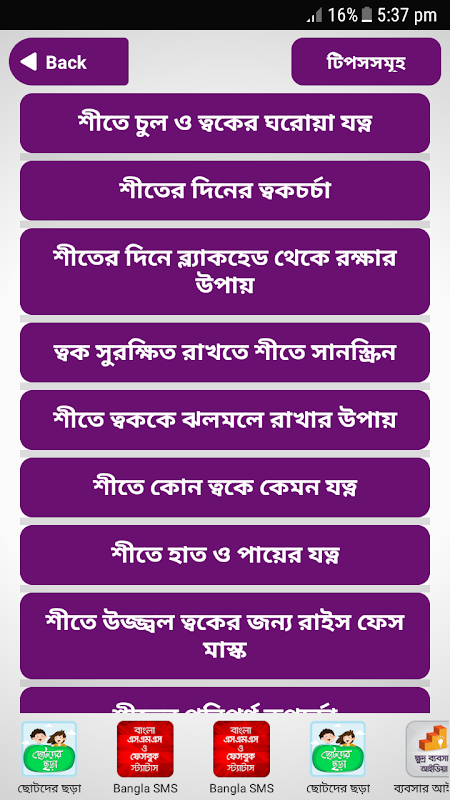 অ্যাপটিতে আরওযা যা অন্তর্ভুক্ত রয়েছেঃশীতে ত্বকের যত্ন(winter skin care-shite toker jotno),শীতে চুলের যত্ন(winter hair care-shite chuler jotno),শীতে মুখের যত্ন,শীতে রূপচর্চা(shite rupchorcha-sheete rupcorca),শীতে ফেসিয়াল(shite facial),শীতে ফেইসপ্যাক( sheete facepack-shite facepack),শীতের যত্নে টিপস(winter care tips bangla),মেয়েদের রূপচর্চা,চুল পড়া সমসসার সমাধান(chuler tips-hair care)