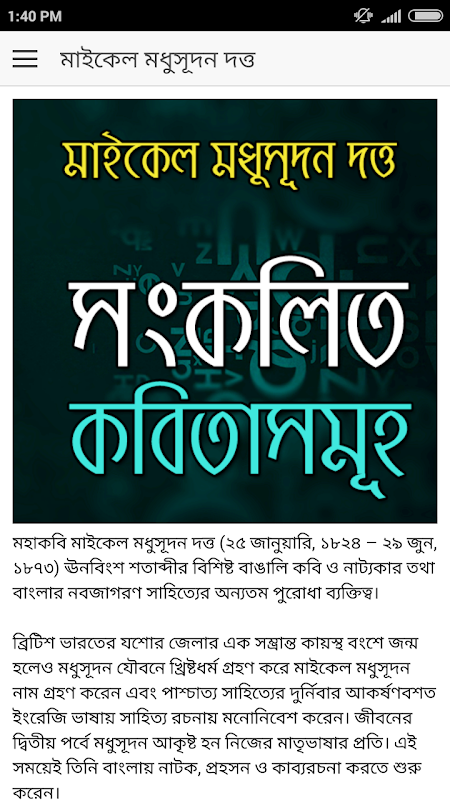 Michael Madhusudan Dutt, or Michael Madhusudan Dutta (Bengali: মাইকেল মধুসূদন দত্ত (About this sound Maikel Modhushudôn Dôtto (help·info)); 25 January 1824 – 29 June 1873) was a popular 19th-century Bengali poet and dramatist. He was a pioneer of Bengali drama. His famous work Meghnad Bodh Kavya, is a tragic epic. It consists of nine cantos and is exceptional in Bengali literature both in terms of style and content. He also wrote poems about the sorrows and afflictions of love as spoken by women.