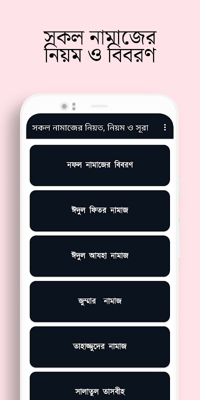 আসসালামু আলাইকুম। প্রতিটি মুসলিম নর-নারী উভয়ের জন্য নামাজ পড়া ফরজ বাধ্যতামূলক। আমরা এই নামাজ পড়ার সঠিক নিয়ম অনেকেই জানিনা ত াই আপনাদের জন্য নিয়ে আসলাম সকল প্রকার নামাজের নিয়ত 、 নিয়ম ও নামাজের প্রয়োজনীয় অ্যাপ। খুব সহজে নামাজের সঠিক নিয়ম জানতে পারবেন। চিত্রসহ পুরুষ ও মহিলাদের জন্য আলাদা করে নামাজ পড়ার সঠিক নিয়ম পাবেন। এই অ্যাপে রয়েছে ফজর নামাজের নিয়ত ও নিয়ম, যোহ 、 、 、 、 、 、 、 、 、 、 、 、 、 、 、 、 ম、মাগরিব নামাজের নিয়ত ও নিয়ম、এশার নামাজের ন িয়ত ও নিয়ম। এছাড়াও আছে তাহাজ্জুদ নামাজ পড়ার নিয়ত ও নিয়দ 、 、 、 、 、 、 、 、 、 、 、 、 、 、 、 、 、 、 、 、 、 ের সঠিক নিয়ম ও নিয়ত, ঈদুল আযহা ও ঈদুল ফিতর নামা জের সঠিক নিয়ম। জানাযা নামাজ পড়ার নিয়ম、ফরজ、ওয়াজিব、সুন্নত ও নফল সকল নামাজ পড়ার সঠিক নিয়ম ও নিয়ত সহ અ্যাদ টি সাজানো হয়েছে। নামাজের স্থায়ী ক্যালেন্ডার সময় সূচী এবং সেহ রি ও ইফতারের সময় সূচি পাওয়া যাবে। আরো আছে আল্লাহর পরিচয় ও গুনবাচক নামসমূহ, আজান ও ইকামাত、পাঁচ কালেমা、ওযু গোসল করার ইসলামিক নিয় ম ও পবিত্রতা অরজন、রোজার বিবরণ ও রোজা ভঙ্গগের ক ারণ। তায়াম্মুমের নিয়ম ও নষ্ট হওয়ার কারন、কাযা না মাজের বিবরণ, নামাজের মধ্যকার দোয়া ও তাসবিহসমু হ, নামাজের জন্য প্রয়োজনীয় সূরাসমূহ, নামাজ ভঙ গের কারন ও মাকরুহ সমূহ, হজ্জ ওমরাহ ও যাকাতের নি় নি় ম। কোরবানীর ও আকীকার বিবরণ, ফযিলতপূর্ণ দোয়া ও আম ল শিক্ষা, বিভিন্ন প্রকারের সগীরা কবীরা গুনাহের বিবরণ। অ্যাপটিতে মূলত ইসলামের মোলিক বিষয়গুলো তুলে ধ রা হয়েছে।