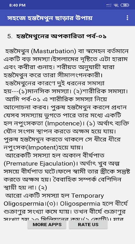 আমাদের এই এপ্রিকেশনটির মাধ্যমে আমরা আপনাদের জানাতে চেস্টা করবো কি ভাবে আপনারা এই হস্তমৈথুনে থেকে পরিত্রান পেতে পারেন এবং এর ক্ষতির দিকগুলো সম্পর্কে জানতে পারেন। আমরা বিভিন্ন বিশেষজ্ঞদের মতামত ও পরামর্শ আপনাদের কাছে তুলে ধরার চেষ্টা করছি মাত্র। আমাদের সাথে থাকার জন্য ধন্যবাদ।