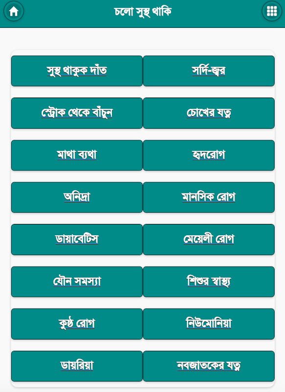 সুস্থ থাকার উপায় সমূহ জানতে এবং আমাদের পরিবারের সবাইকে সুস্থ রাখার জন্যে এই অ্যাপটিতে যেসকল বিষয় একসাথে পাবেন; সেগুলো হোলঃ