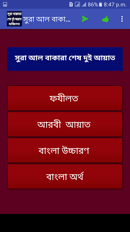 সূরা বাকারা এটা কুরআনের দ্বিতীয় সূরা। সবচেয়ে বড় ও গুরুত্বপূর্ণ একটি সূরা যা মদিনায় অবতীর্ণ। এতে মোট ২৮৬টি আয়াত আছে।এ সূরার শেষ দুই আয়াত অর্থাৎ ২৮৫ ও ২৮৬ নম্বর আয়াতের গুরুত্ব ফজিলত অনেক বেশি।আরবি আয়াত সহ সরল ও সাবলীল ভাষায় বাংলা উচ্চারণ সহ তুলে ধরা হয়েছে।এ ইসলামিক অ্যাপটি আপনি আরও পাবেন সূরা বাকারা এর ফজিলত ও কিভাবে আমল করবেন তার সম্পর্কে ধারণা।
