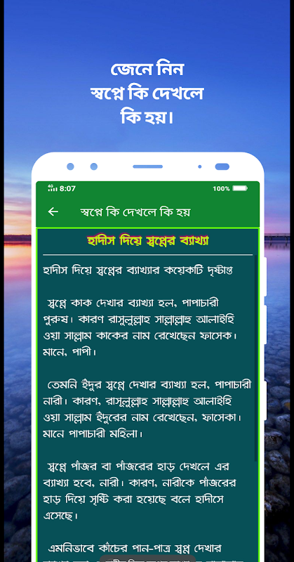 মানুষস্বপ্নদেখে。 ভালস্বপ্নদেখে、বলেসুন্দরস্বপ্নদেখেছি。 দেখেখারাপস্বপ্ন、বলেভয়ানকএকস্বপ্নদেখেছি。 আবারকখনোবলেএকটিবাজেস্বপ্নদেখেছি।দিন-ক্ষণ、তিথি-নক্ষত্রইত্যাদিরপ্রেক্ষিতেএসমস্তস্বপ্নেরফলকখনোকখনোসত্যিহয়、মোহাম্মদীখাবনামাঅনুযায়ীবিভিন্নস্বপ্নেরবিবিধফলাফলজেনেনিন。
