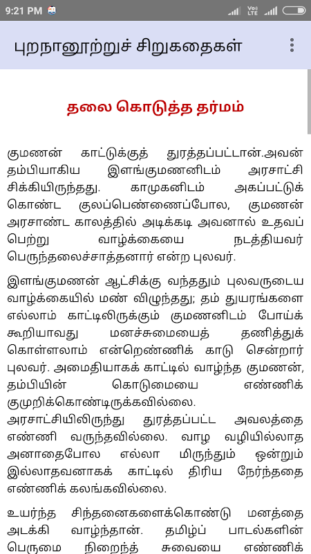これらは週末にある郊外の郊外です。 Parthasarathyは書きました。 மாணவர்களுக்கோ சின்னஞ்சிறுவர்க்கோ, நேரே புறநானூற்றுப் புத்தகத்தைக் கையிலெடுத்துப் பாடல்களையும், பதவுரையையும் படித்தால்கூட இவற்றில் இவ்வளவு சுவையான சம்பவமோ, கதையோ, நிகழ்ச்சியோ அமைந்திருப்பது புரிந்துவிடாது.ஆனால் இந்நூலில் பாடல்களுக்கு முன்பாக இங்கு விவரிக்கப் பட்டிருப்பதுபோல, விவரிக்கப்பட்ட விளக்கத்தைப் படித்தால் புறநானூற்றுப் பாடலிலுள்ள சுவை புலப்படும்.これらにはபார்த்தசாரதி விளக்க எடுத்துக் கொண்டவை போன்ற தேர்ந்தெடுத்த சிலவற்றை விளக்கும் மாணவர்களுக்கான துணைப்பாடநூல் ஒன்றை முன்பு நா. Parthasarathyは書きました。学生の間には良い反応があった。この本はいくつかの版の仲間でした。