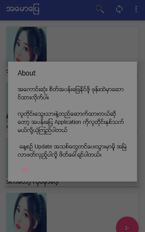 လူတိုင္​း​ေသြးသားနဲ႔တည္​​ေဆာက္​ထားတယ္​ဆို​ေတာ့ အပန္းေျပ​ Application ကိုလူတိုင္​းႏွစ္​သက္​မယ္​လို႔ယံုၾကည္​ပါတယ္​။ ေန႔စဥ္ Update အသစ္ေတြတင္ေပးသြားမွာမို့ အၿမဲလာဖတ္လွည့္ပါလို့ ဖိတ္ေခၚခ်င္ပါတယ္။