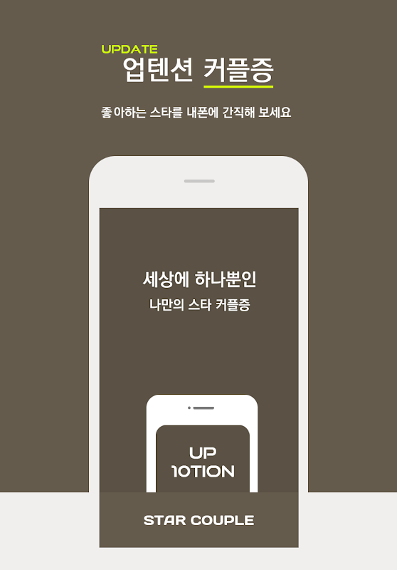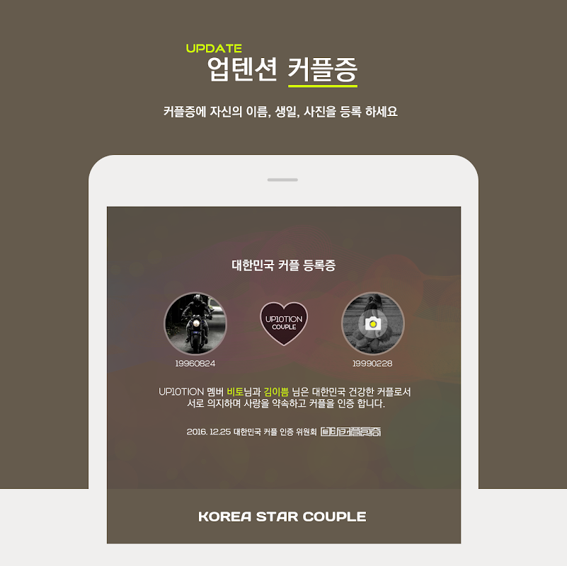 매니아 팬덤 이라면 누구나 꿈꾸는 나만의 스타와 커플증을 만드는 앱으로 좋아하는 업텐션 멤버를 선택하여 가상의 커플증을 만들어 보세요.