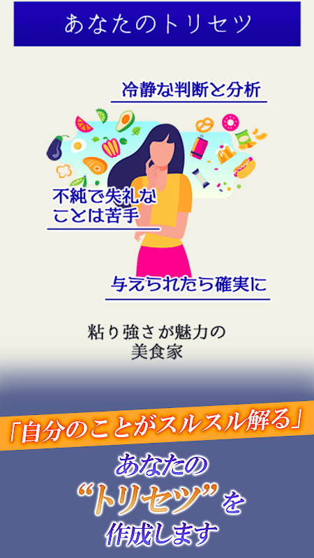「トリセツ」とは取り扱い説明書のこと。あなたがどんな人となりか、どんな性格をしているのか、どう自分と向き合えばよいのか。取り扱い説明書のように丁寧にあなたについて説明をしていきます。
