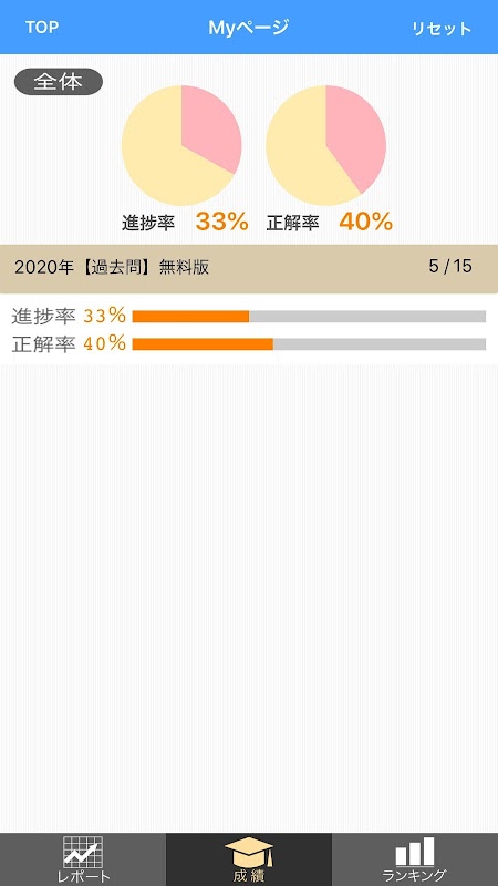 「レポート」であなたの学習時間を確認できます。「成績」で全体およびカテゴリごとの問題の進捗率、正答率を確認できます。 「ランキング」で学習時間、成績を元にしたポイント・ランキングを確認できます。ランキングは、ランクと今週の2種類があります。