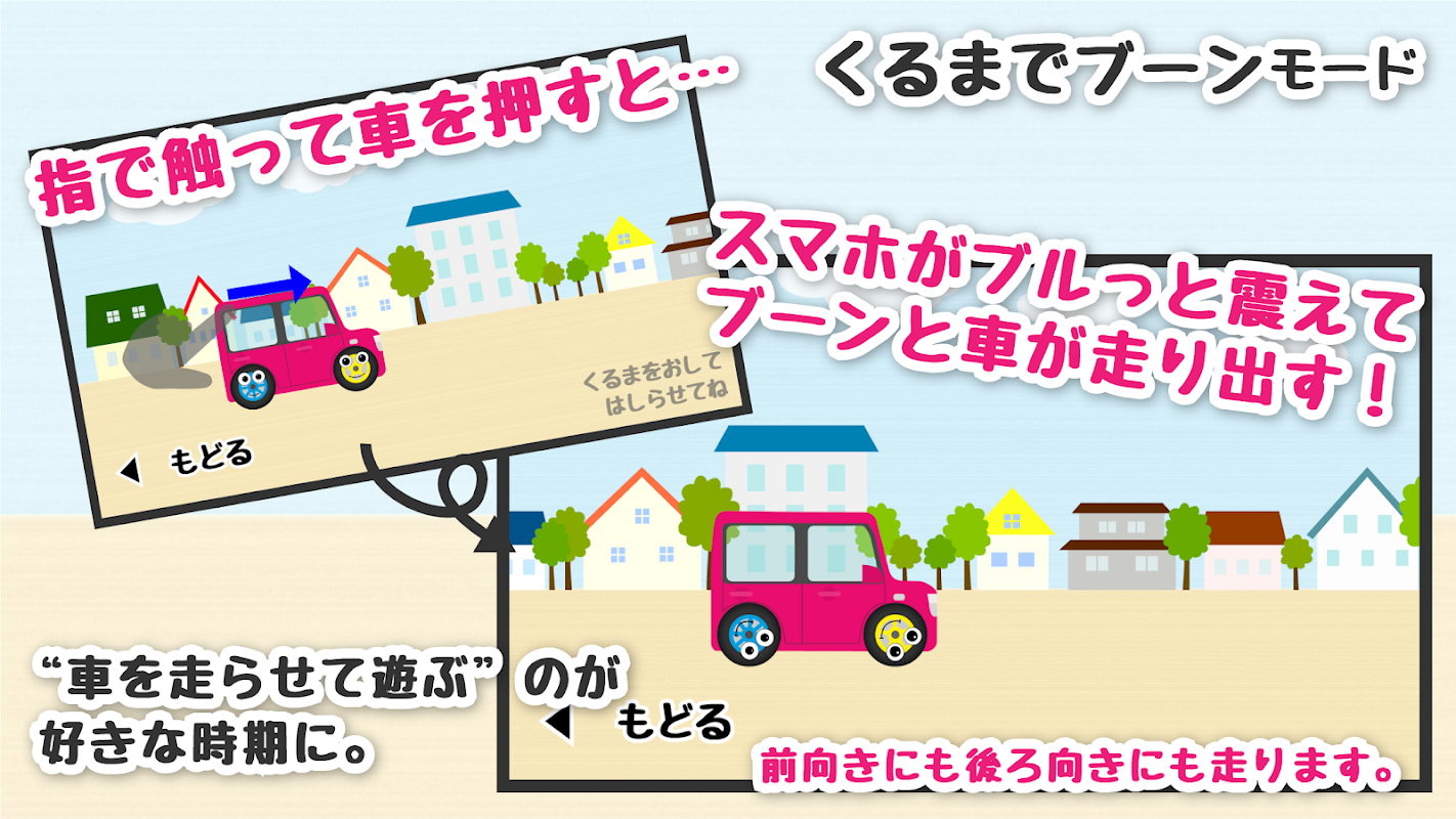 「くるまでブーンモード」では、車を押すように指で触ると、端末がブルっと震えて(※)車がブーンと走り出す!もちろん、押す方向に合わせて、前向きにも後ろ向きにも走ります。また、押し方によって、たくさん走ったり、少ししか走らなかったりと、現実に近い感覚で車が走ります。“車を走らせて遊ぶ”のが好きな時期にオススメなモードです。