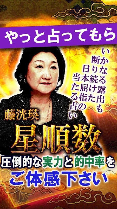 やっと占ってもらえる日が来ました。いかなる露出も拒み通づけた、日本屈指の秘蔵鑑定。鑑定師・会員2000人の頂点に立つ「藤洸瑛」の鑑定をあなたのお手元でお楽しみください。とにかく当たる。とにかく具体的。言われたその通りになると言われる「星順数」という特別な鑑定法を用いてあなたの現実に迫っていきます。深刻愛・複雑愛・禁断愛・人生・仕事・結婚。あなたのその現実に今、答えを下していきましょう。