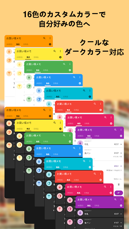 商品の「お買い得!」と思う値段や底値、最安価格、セール価格をメモしておけば忘れません。お店や数量・容量もメモできるから、単位あたりのお値段も簡単計算!簡単比較!