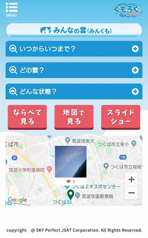 楽しみながら気象の知識が身につくアプリ「くもろぐ」では人工知能「KMOMY:くもみ」があなたの撮った雲の形・状態を判定し、時刻や場所と合わせて日記のように記録してくれます。KMOMYの判定精度は85%程度(自社調べ)で今後向上していきます。KMOMYが判定したあなたとみんなの雲は日付/種類/状態で検索することができます。
