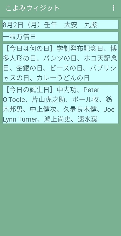 ウィジェットにその日の干支、六曜 九星 一粒万倍日、天赦日、寅の日、記念日、有名人の誕生日を表示します。