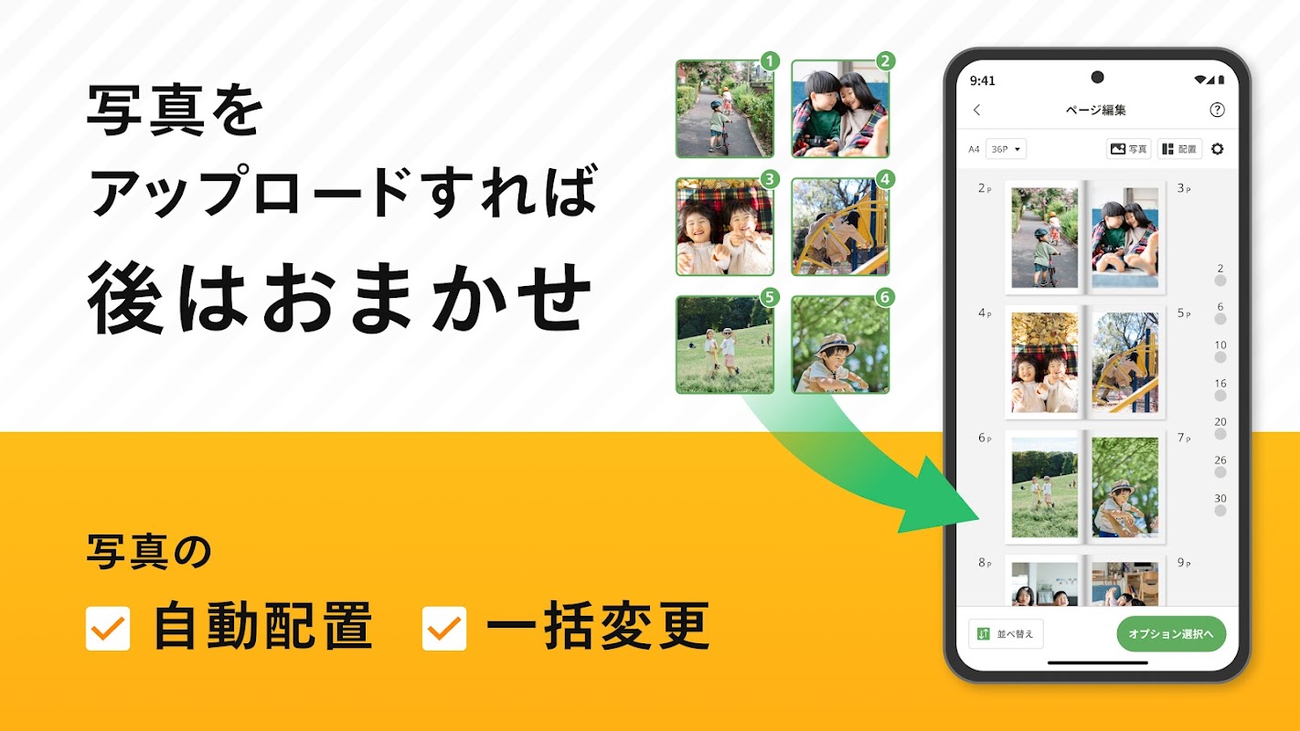 写真の自動配置機能や一括レイアウト変更に対応。写真選択も簡単になりました。