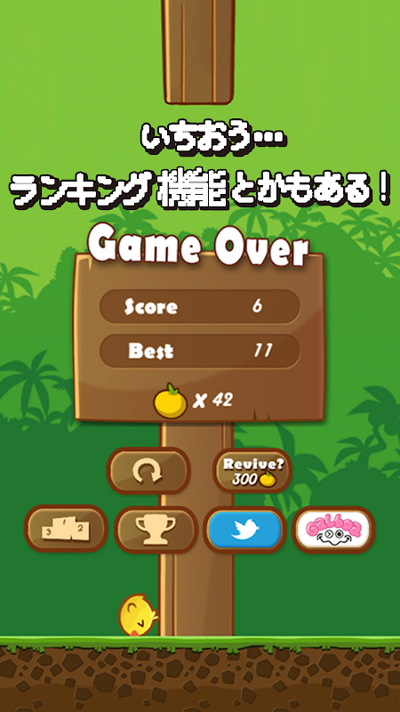 画面タップでかわいい「とり肉」をうまくジャンプさせ、大好きなみかんをGET!