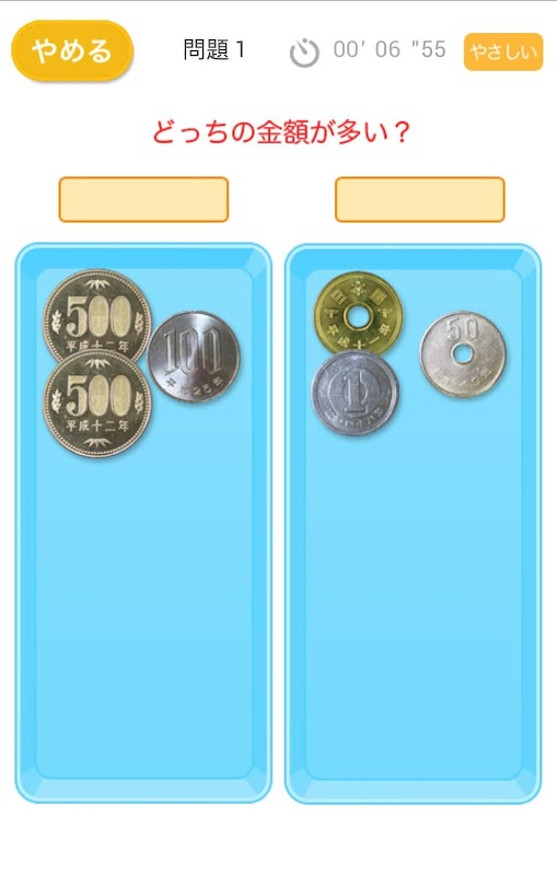 あそんでまなぶ!シリーズのどっちの金額が多い?です。 お金の合計が大きいほうを当てるアプリです。
