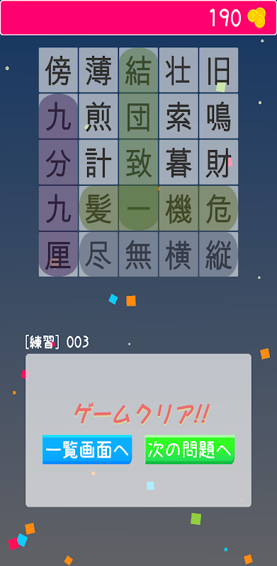 四字熟語は、→(左から右)、←(右から左)、↓(上から下)、↑(下から上)、↘(左上から右下)、↗(左下から右上)、↙(右上から左下)、↖(右下から左上)の8方向に並んでいます。また、ゲームクリア数が増えるに連れて盤面数が多くなり、四字熟語も難しくなっていきます。