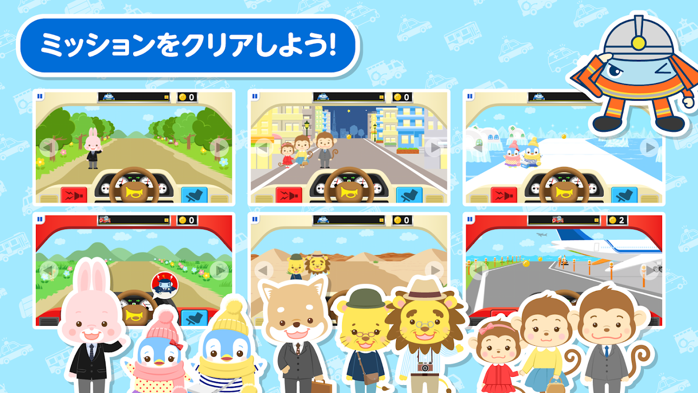 このアプリは、色々な「はたらくくるま」を自分で運転してみる体験を通して、普段街中で目にする多くの車が、どんな働きをする車なのかを考えるきっかけとなり、お子さまの、外の世界に対する豊かな好奇心を養います。