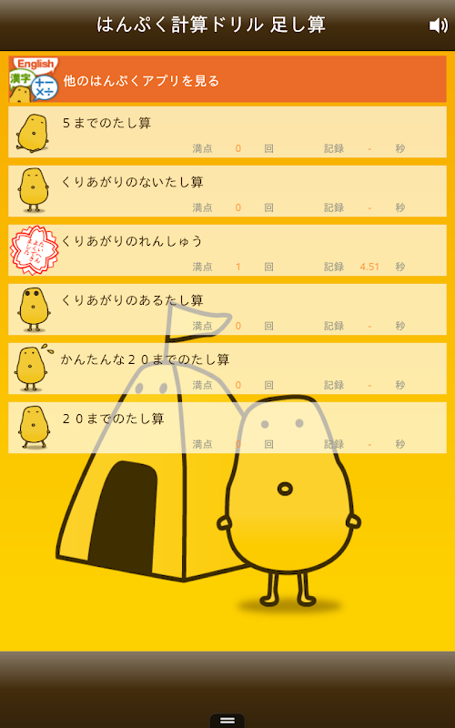 片手の指を使って確認できる5までの足し算から始まり、繰り上がりの練習、20までの足し算、と小学1年生の算数で学習する足し算を少しずつステップアップしながら習得できるメニュー構成になっています。