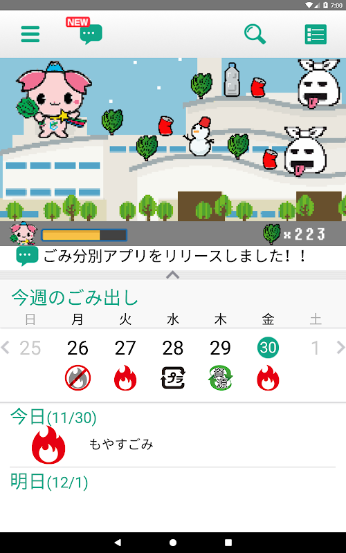 収集日変更のお知らせやイベント情報などを確認することができます。