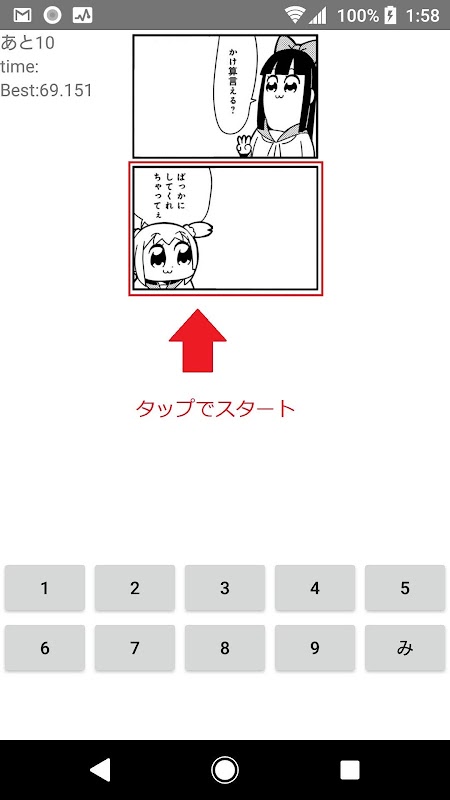 ポプテピピックのポプ子が2桁のかけ算を答えるkusoアプリ2コマ目の「ばっかにしてくれちゃってぇ」をタップでスタート最大は99×99みみんがみ!