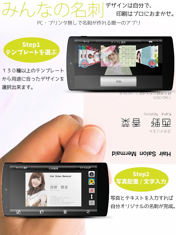 シンプルなビジネス名刺はもちろん、パーソナルカード、オリジナルトレカ、ペット名刺、ママ友名刺、コスプレ名刺など、シチュエーションに応じたお好みの名刺(カード)を作成&即ご注文できるアプリです。
