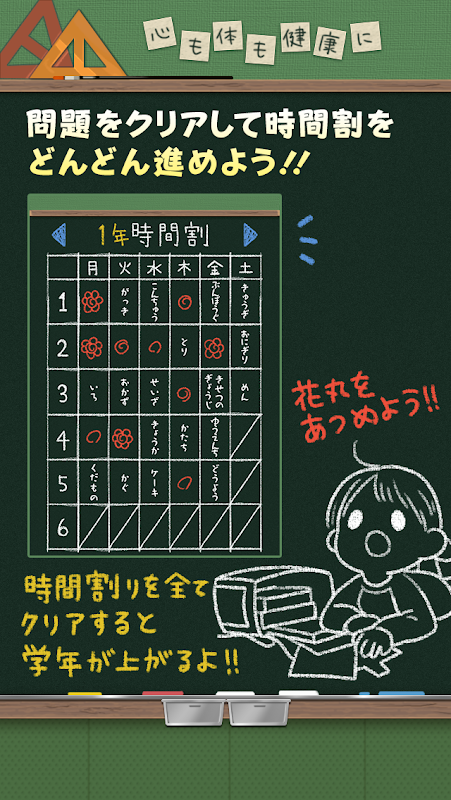 小学校の時間割にちなんだメニューで好きな問題を遊べます。