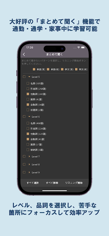 ・ 通勤・通学中にも単熟語が学習できる「まとめて聞く」機能を搭載